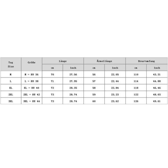 Hinweis: Verkauf nur in Deutschland lokaler Versand.Über diesen Artikel (Wir möchten Ihnen genaue Produktinformationen zeigen)1.Bitte beachten Sie die Größenreferenz, um die richtige Größe zu finden.2.There kann ein geringfügiger Farbunterschied Ursache des Lichtschießens sein.3.Bitte erlauben Sie 1-3cm Unterschied aufgrund der manuellen Messung.Danke für Ihr Verständnis.Pflegehinweise:Vor dem Tragen waschenKalt schonende Maschinenwäsche
